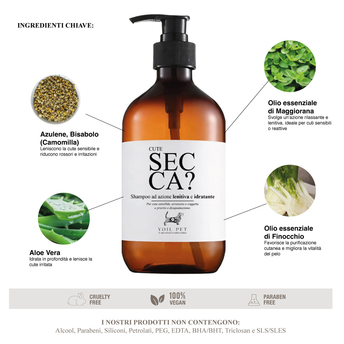 I NOSTRI PRODOTTI NON CONTENGONO: Alcool, Parabeni, Siliconi, Petrolati, PEG, EDTA, BHA/BHT, Triclosan e SLS/SLES
