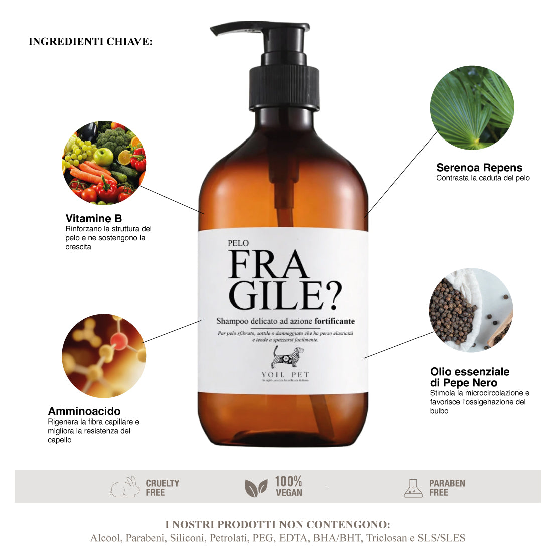 I NOSTRI PRODOTTI NON CONTENGONO: Alcool, Parabeni, Siliconi, Petrolati, PEG, EDTA, BHA/BHT, Triclosan e SLS/SLES
